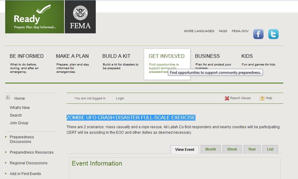 Informações relativas a um exercício bizarro da FEMA em torno de uma "queda de OVNI e invasão de zumbis" em Idaho foram retiradas do ar após chamar muita atenção. O exercício, que acontecerá no dia 27 de abril, na cidade de Moscow, no Condado de Latah, Idaho, vai envolver todos os socorristas do local, bem como municípios vizinhos, além de Equipes Comunitárias de Resposta de Emergência (CERT) sob os cuidados da FEMA. O exercício será centrado em torno de "dois cenários: de baixas em massa e um resgate com cordas", e contará com um total de 100 participantes.